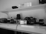 自作の棚を見上げると、カメラが並んでいます(うちで買ったのは中古の二台)。